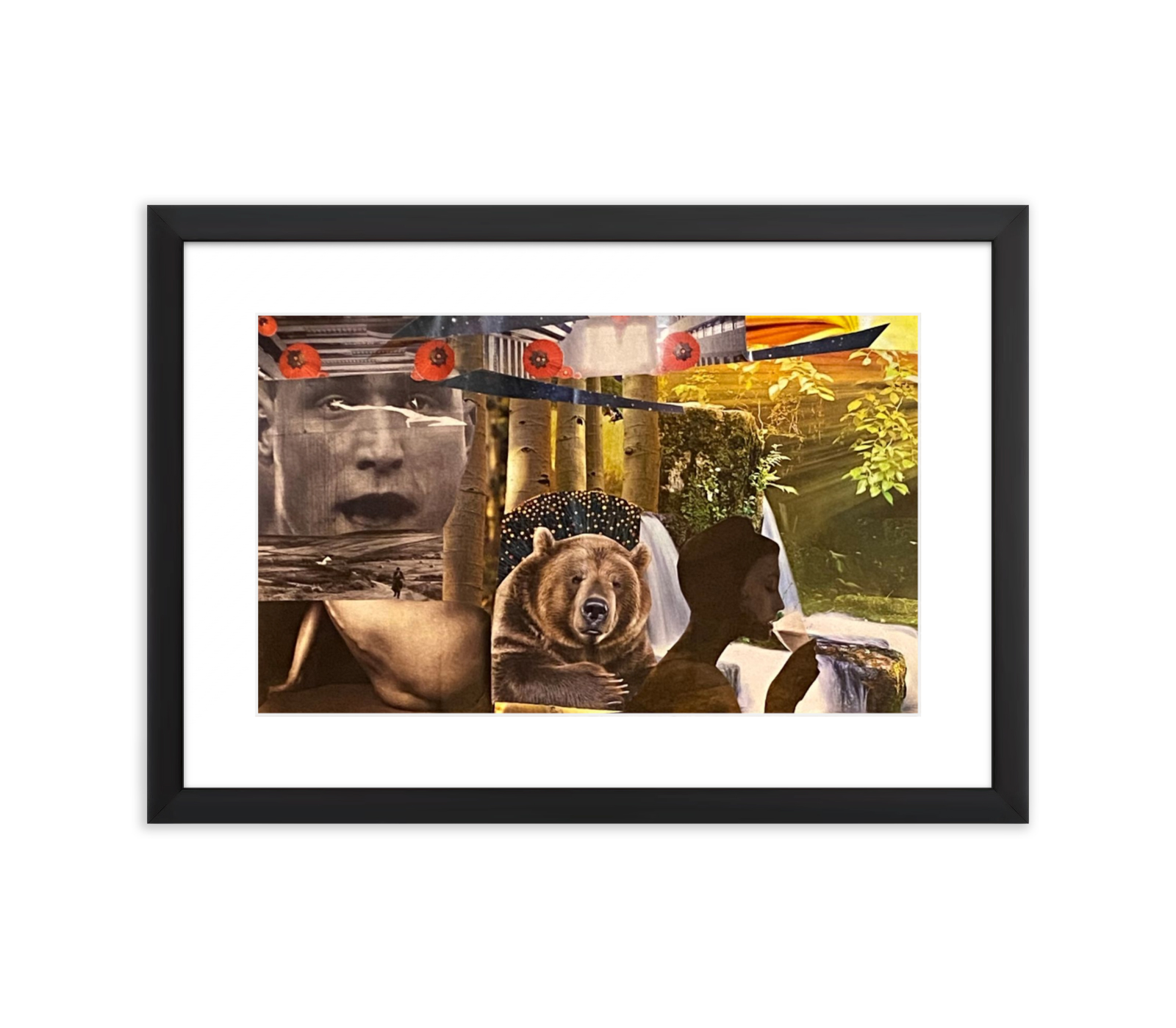 The world divides itself into stark realities. Above, a fragmented, futuristic city rises against a star-dusted night sky, the memory of human effort framed by red poppies and stark birch branches.
