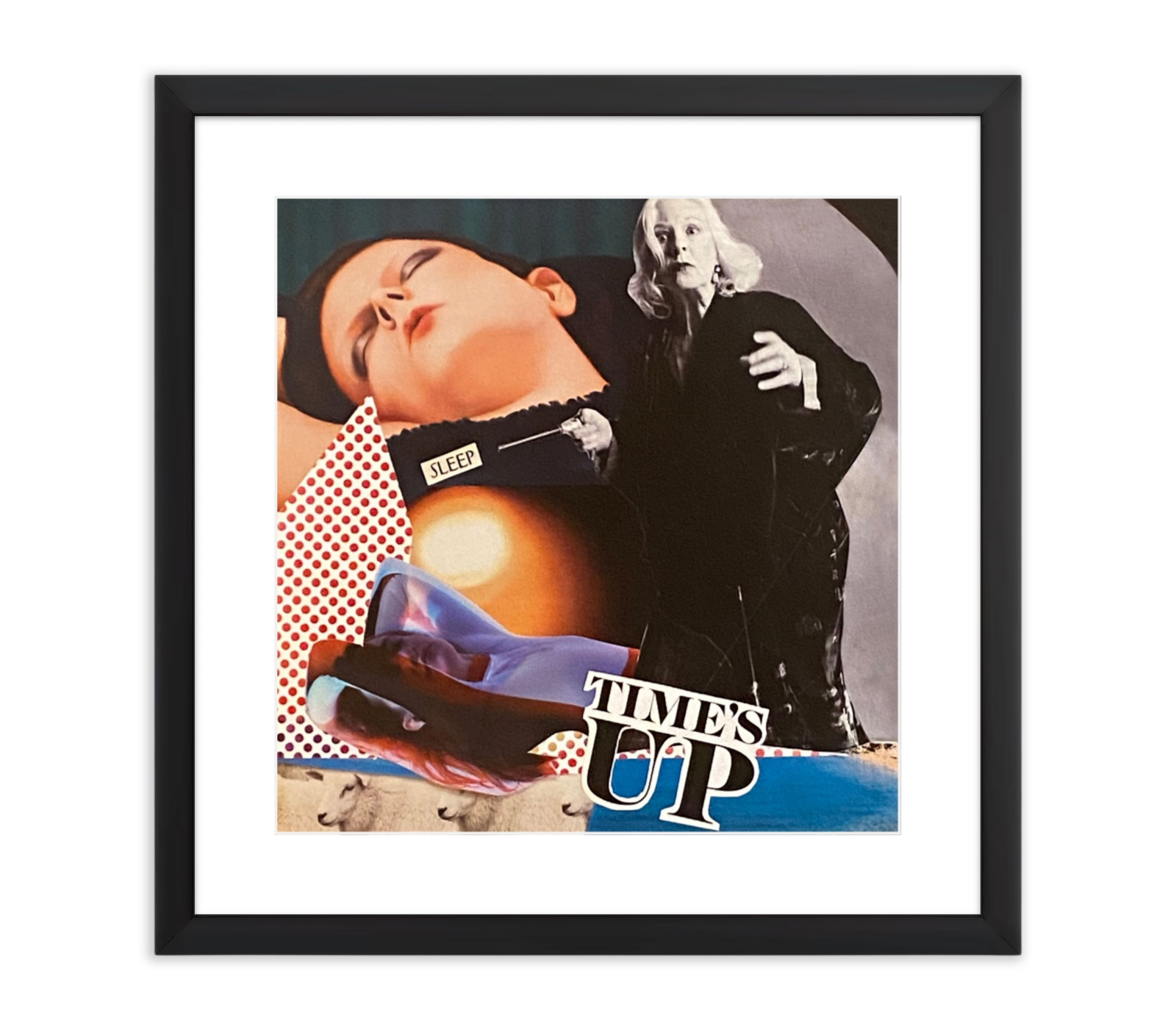 Across the composition, the phrase “TIME’S UP” anchors the scene like a final decree. It signals a necessary pause, the instant when the sleeper’s internal energy, a radiant orange sun glowing at the center, silences the tyranny of the external clock.