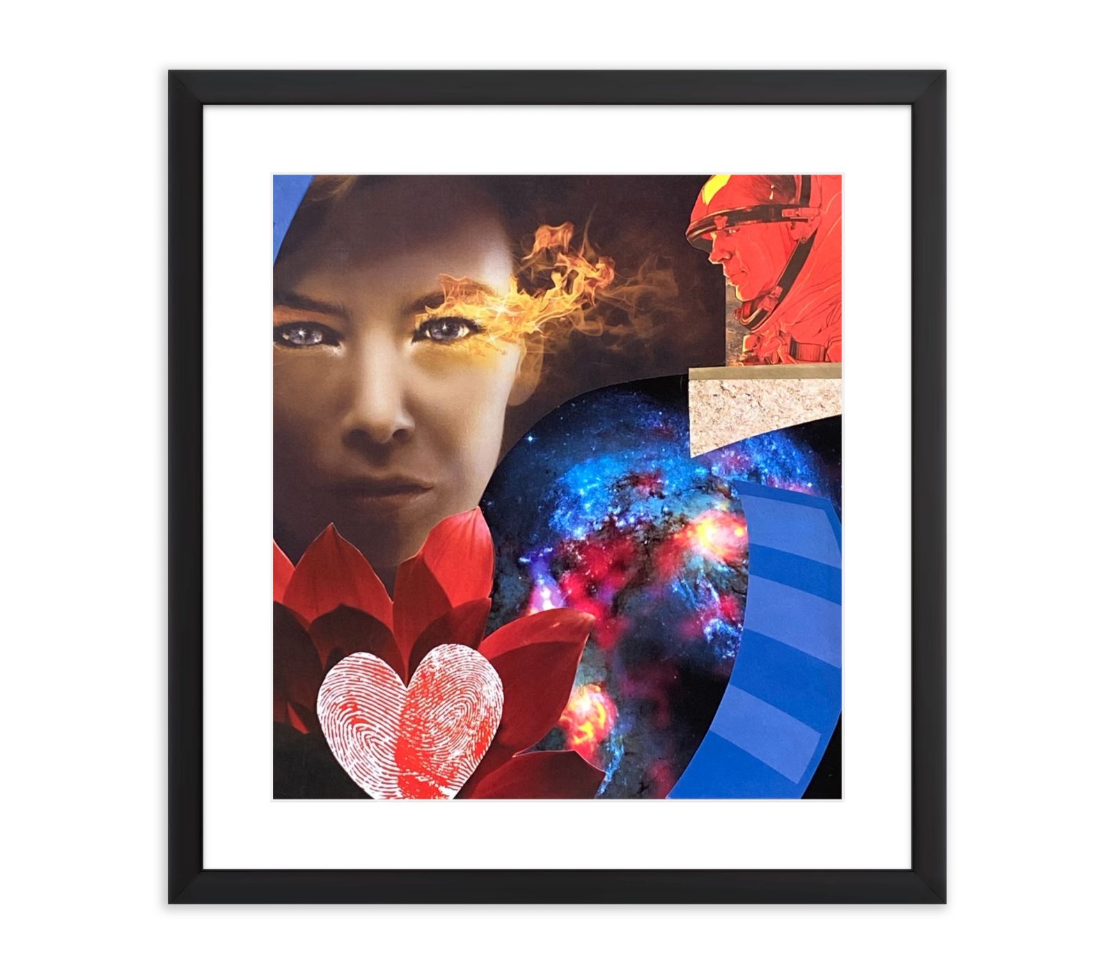 She stands at the center of the universe, a silent witness to a galactic explosion of red, blue, and black. Her eyes burn with unwavering focus, pools of intensity rimmed by flames of pure emotion. This fire is not destructive; it is the light of absolute, consuming love, sending its heat across the cosmos.